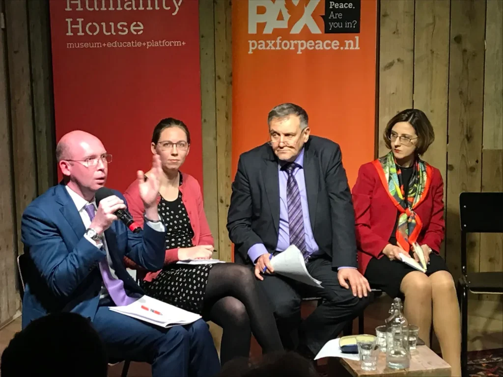 Meanwhile, on the ground in Eastern Ukraine, PAX for Peace is working to build bridges between the populations of the warring sides, said program officer Marieke Droogsma. The NGO is training “peace engineers” who help to create a culture of dialogue between parties on both sides of the divide. This also helps to strengthen social cohesion, making people more resilient to disinformation and other hybrid war tactics. The conflict in the Donbas tends to push the dramatic situation in the annexed Crimean peninsula out of the public limelight, said Olexiy Starodubov of the Crimean Expert Center . The human rights situation is dramatic, especially for the indigenous Crimean Tatar minority, and the area has turned into an economic black hole. Monitoring by international organizations could help to strengthen civil society in Crimea. In the meantime, Starodubov wants sanctions to continue – if only as a political symbol of non-recognition of the Russian annexation. The discussion then focused on what the EU could do to remedy in conflict situations such as Ukraine. “The EU is successful as a peace project, but does it also function as a peace actor beyond its external borders?” asked Jan Marinus Wiersma of the Netherlands Institute of International Relations Clingendael . “The Union relies on the soft power of money and diplomacy, among others in Ukraine and Georgia, but it lacks leadership,” Robert Serry, chairman of UPEACE Center The Hague , is pessimistic. Multilateralism is in decline, and the United Nations Security Council is finding it harder to stop Member States from using or condoning violence. “If the UNSC won’t function and NATO falls apart, then the EU will have to defend itself.” For more information, click on the hyperlinks. Photo: Olexiy Starodubov (Crimean Expert Centre), Marieke Droogsma (PAX for Peace), Olexiy Haran (Kyiv Mohyla Academy) and Ketevan Chumbadze (Georgian Ministry of Foreign Affairs). (by Diederik Kramers)